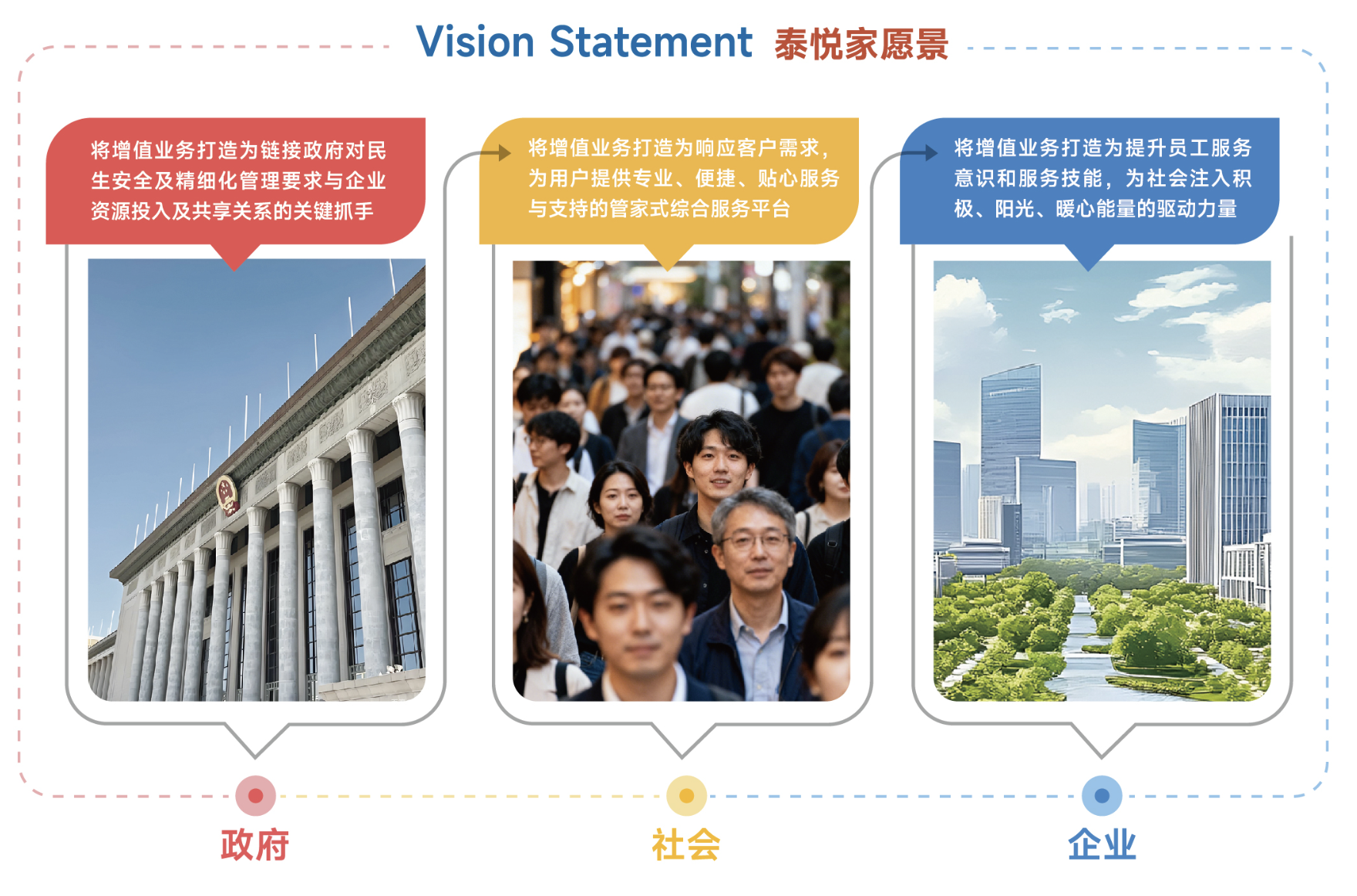难能可贵的是,泰悦家公司在充分融合社会关注、民生诉求和企业自身发展的基础上构建了公司发展愿景,明确要将增值业务打造为链接政府对民生安全及精细化管理要求与企业资源投入及共享关系的关键抓手;打造为响应客户需求,为用户提供专业、便捷、贴心服务与支持的管家式综合服务平台;打造为提升员工服务意识和服务技能,为社会注入积极、阳光、暖心能量的驱动力量。