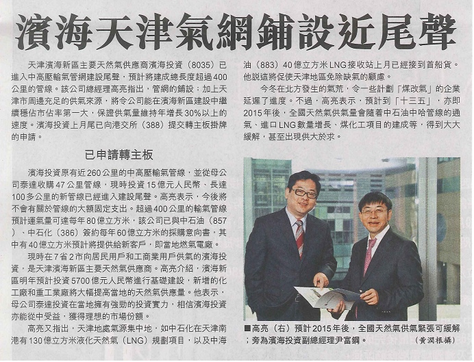 2013年12月19日,滨海投资执行董事总经理高亮先生接受了《香港信报》、《星岛日报》和《大公报》的专访。高亮总经理着重介绍了滨海投资业务快速发展及公司良好的发展前景。并且详细回答了记者关心的问题。